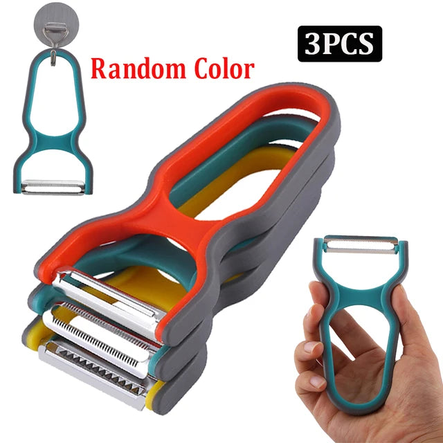 Upgrade your kitchen efficiency with this 3-in-1 Multi-Function Vegetable Peeler Set, featuring three stackable peelers designed to handle a variety of cutting and peeling tasks. Each peeler in this compact set includes a different high-quality stainless steel blade—a standard straight blade for everyday peeling, a serrated blade for soft fruits like tomatoes and kiwis, and a julienne blade for creating perfect veggie strips.