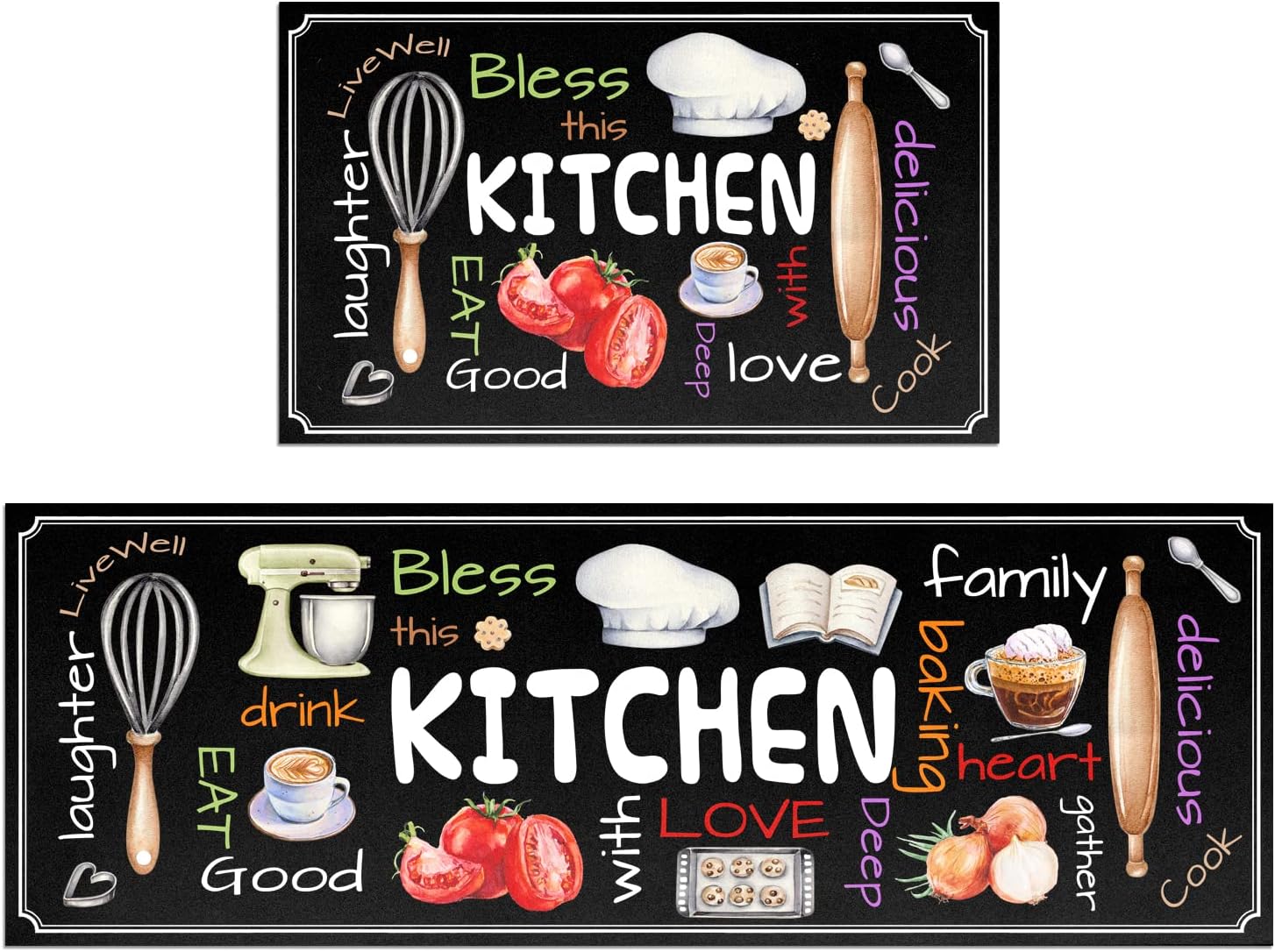 Each mat features inspirational kitchen quotes like "Bless This Kitchen", "Laughter", "Love", and various food and utensil illustrations, creating a cheerful and motivating cooking environment. The soft yet durable surface is made with high-quality fabric, while the anti-slip rubber backing ensures that the mats stay securely in place, preventing accidental slips or movement.
